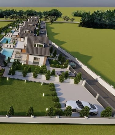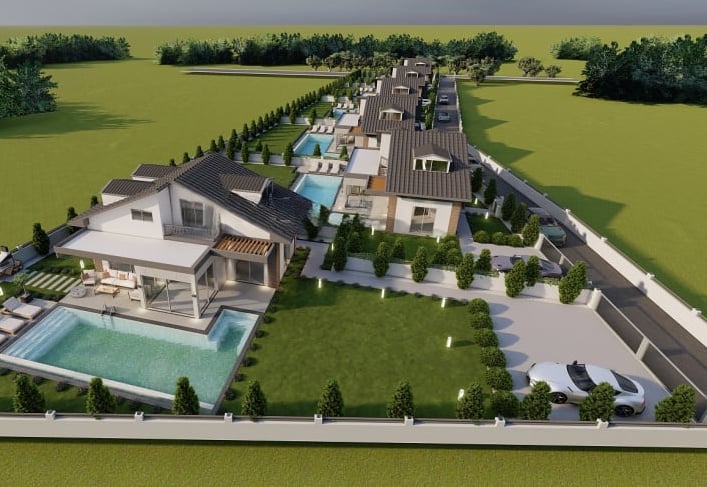 Wille z 3 sypialniami, prywatnymi ogrodami i łazienkami en-suite położone są na działce o powierzchni 700 m2 w miejscowości Muğla w prowincji Fethiye. Dwupiętrowe wille posiadają basen oraz parking.