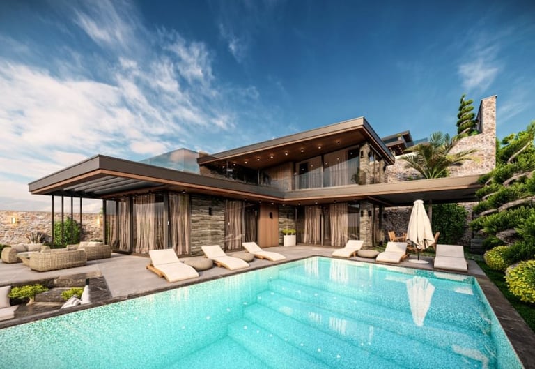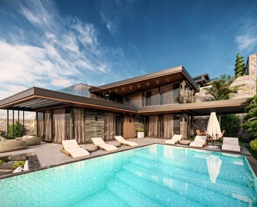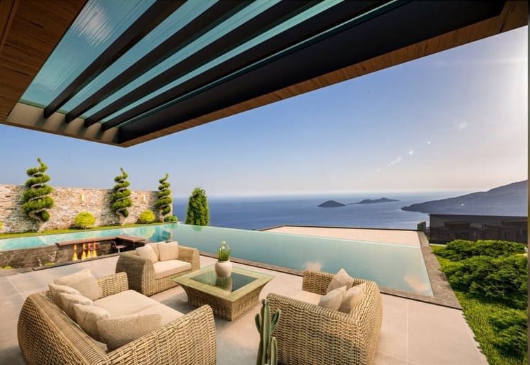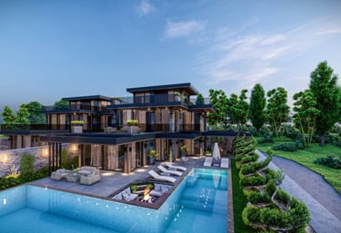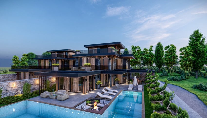 Wille z Panoramicznym Widokiem na Morze i Basenami w Kalkan Wille 5+1 na sprzedaż oferują powierzchnię użytkową netto 460 m². Wille wyposażone są w kryty i odkryty basen, łaźnie tureckie, sauny, jacuzzi, sale fitness i sale kinowe.